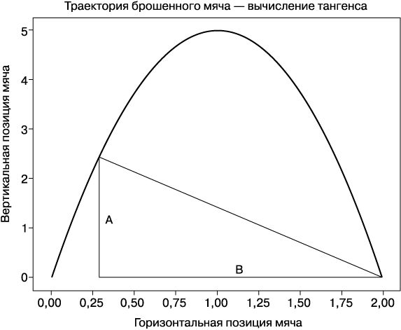 В процессе полета угол линии видимости игрока продолжает расти, и игрок вынужден закидывать голову назад, пока не поймает мяч. Обозначим угол между землей и линией видимости θ. Будем считать, что игрок стоит в точке падения мяча (x = 2). Вспомните из школьного курса геометрии, что тангенс угла прямоугольного треугольника равен отношению противолежащего катета к прилежащему. В данном случае тангенс θ равен отношению высоты мяча к его горизонтальному расстоянию от игрока. Следующий фрагмент Python наносит на график стороны, отношение которых определяет тангенс: