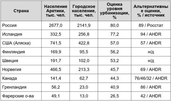 По итогам пересчета городского населения по единым критериям уровень арктической урбанизации оказался в большинстве случаев ниже, чем обычно считается (табл. 1). Расхождение, очевидно, объясняется исключением из анализа городов (в России также поселков городского типа) с населением ниже порогового. В официальной статистике большинства арктических стран существует значительное количество населенных пунктов, формально считающихся городскими, но с точки зрения принятого в данной работе критерия таковыми не являющихся.