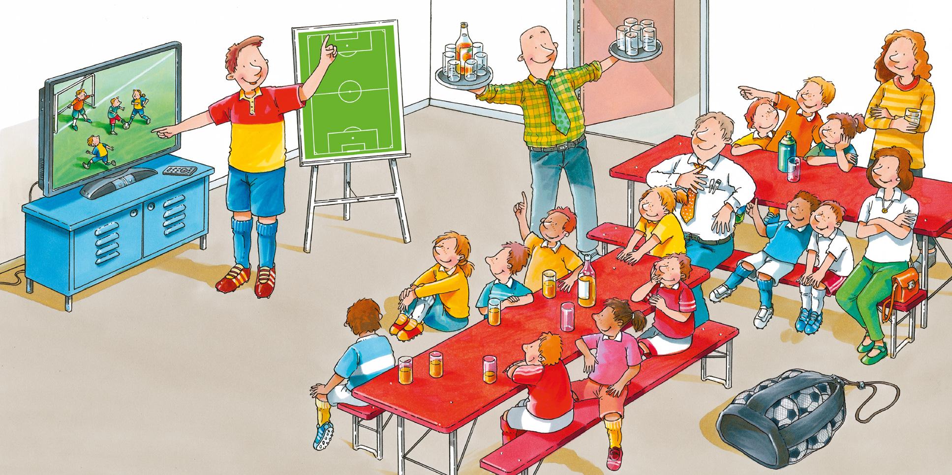 После тренировки у нас собрание в здании клуба вместе с родителями. Так как завтра важный кубковый матч, Норберт заранее обсуждает с нами тактику и расстановку игроков на поле. Он даже снял на камеру нашу предыдущую игру, чтобы показать нам, какие ошибки мы допустили и что можно сделать лучше. В качестве угощения нам приносят большую бутылку яблочного сока с минеральной водой. Вкуснятина!