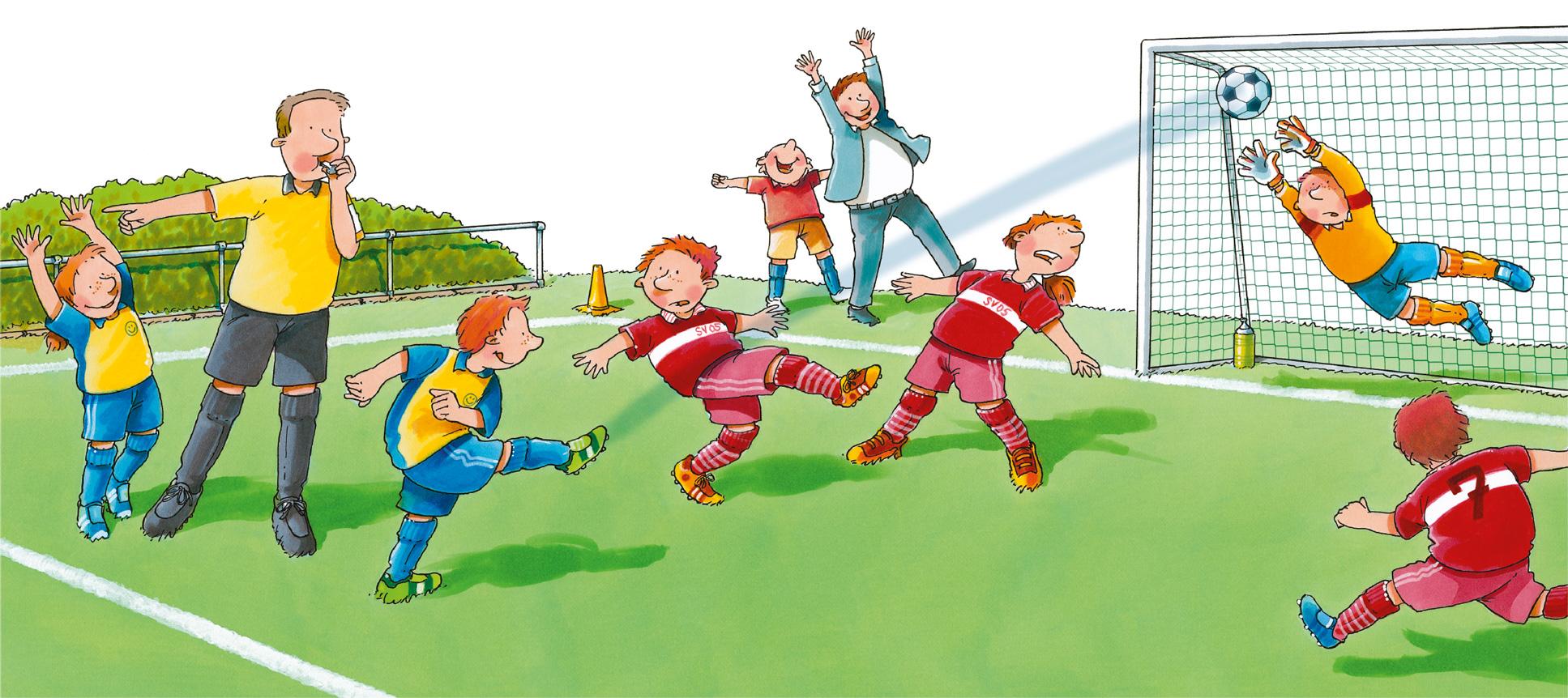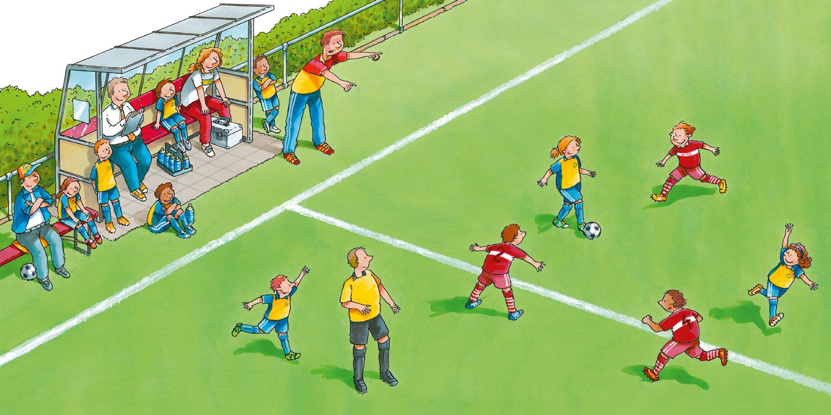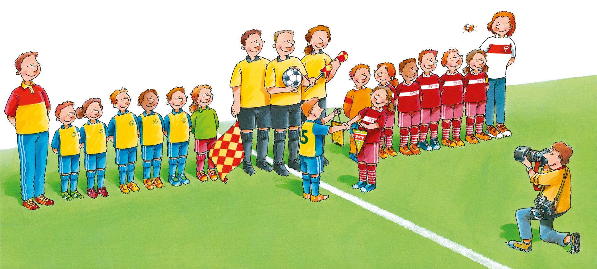 Сегодня важный день. Обе команды выстраиваются для приветствия в центре поля вместе с судьями и тренерами. Капитаны команд вручают друг другу маленькие клубные вымпелы и обмениваются рукопожатием. Судья призывает всех к честной игре, и вскоре после этого начинается первый тайм.