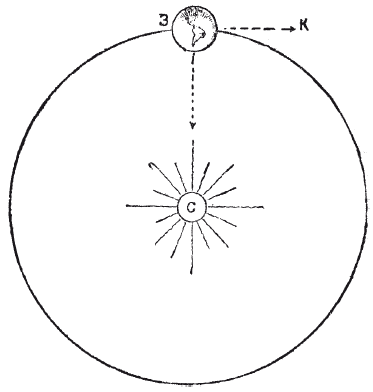Рис. 3. Действие солнечного притяжения на Землю По инерции Земля стремится двигаться по касательной ЗК; притяжение Солнца заставляет ее уклоняться от касательной и переводит на криволинейный путь