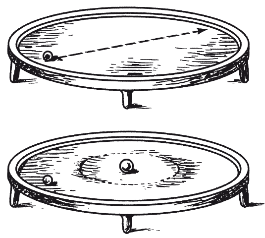 Современное[4] представление о сущности тяготения (учение А. Эйнштейна) рассматривает его вовсе не как силу природы, а как своеобразное воздействие материи на форму окружающего пространства: пространство в соседстве с материей приобретает кривизну. Уяснить себе это крайне необычное воззрение можно отчасти с помощью следующей аналогии. У вас имеется натянутая на обруче ткань; вы пускаете по ткани (мимо центра) легкий шарик – он покатится по прямой линии. Но вообразите, что вблизи пути легкого шарика положен на ткань крупный свинцовый шар. Он вдавит под собою ткань в виде чашки; легкий шарик, пущенный в прежнем направлении, не пронесется мимо этой чашки по прямой линии, а будет втянут вдавленностью и закружится по ее склонам вокруг свинцового шара, как планета около Солнца. Планеты – такова сущность учения Эйнштейна – обращаются вокруг Солнца не потому, что отклоняются от прямолинейного пути притягательной силой центрального светила, а потому, что пространство, окружающее Солнце, искривлено.