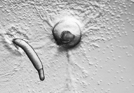 Было бы достаточно безумным пытаться определить среди ископаемых бактерий, многие миллиарды которых остались для нас безызвестными, какой конкретно вид первым занялся проблемой совместного выживания. Но, вероятнее всего, это была какая-то живая субстанция вроде грекса. Что такое грекс? Вы не поверите, но это что-то вроде 300 спартанцев микромира. Псевдоплазмодий или «псевдослизняк», согласно официальному определению, есть не что иное, как толпа амеб. В эту толпу собираются амебы семейства Acrasidae или Dictyosteliida. Вообще «грекс» в переводе с латинского – стая, а не толпа, но ввиду их количества, слова «толпа» или «стадо» явно уместнее. Амебки собираются и формируют массу, которая ведет себя настолько организованно, что больше похожа на микрослизня или на полноценный многоклеточный организм. Прежде чем они решат собраться вместе, чтобы сформировать грекс, амебы блуждают как независимые и самодовольные клетки, пасутся на разных бактериях и продолжают вести такой разгульный образ жизни до тех пор, пока есть благоприятные условия. Но, когда наступают «темные времена», амебы испытывают стресс. Обычно это происходит из-за нехватки пищи. В этот период они решают суммировать свои силы по выживанию и собираются в стадо – грекс. В зависимости от вида и обстоятельств, форма грекса и процесс его образования будут варьироваться. Но в целом это работает так: амебы в стрессовом состоянии производят феромоны, которые сигнализируют о стадии сбора в вертикальный столбик. Когда столб из паникующих амеб становится слишком высоким, он… падает. И превращается в слизняка, вернее его форму – грекс.