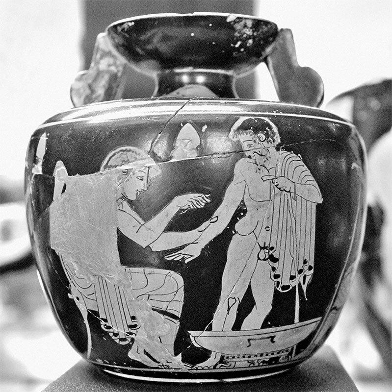 Древнегреческий сосуд с изображением врача, выполняющего кровопускание (ок. 480–470 годов до нашей эры, Лувр, CA 1989, CA 2183)