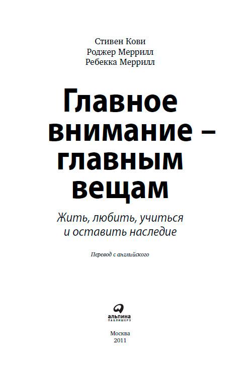 Главное внимание — главным вещам: Жить, любить, учиться, оставить наследие / Стивен Кови, Роджер Меррилл, Ребекка Меррилл; Пер. с англ. — М.: Альпина Паблишерз, 2011.
