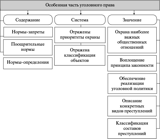 Уголовно-правовые нормы, предусматривающие наказание за отдельные виды общественно опасных деяний, в своей совокупности образуют Особенную часть российского уголовного права. Если нормы Общей части в целом определяют принципы, основания и пределы ответственности лиц, признанных виновными в совершении отдельных видов преступлений, то нормы Особенной части содержат конкретные уголовно-правовые запреты и устанавливают меры уголовного наказания, применяемые за их совершение. Общая и Особенная части составляют единое уголовное право России, служащее задачам охраны прав и свобод человека и гражданина, собственности, общественного порядка и общественной безопасности, окружающей среды, конституционного строя Российской Федерации от преступных посягательств, обеспечения мира и безопасности человечества, а также предупреждения преступлений.