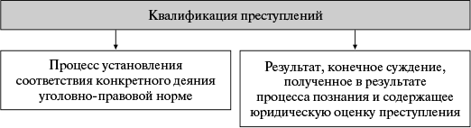 Квалификация понимается двояко: во-первых, как процесс установления соответствия конкретного деяния уголовно-правовой норме, т. е. логический процесс познания юридической сущности совершенного общественно опасного деяния; во-вторых, как результат, вывод, конечное суждение, полученное в результате процесса познания и содержащее юридическую оценку имеющегося преступления. В процессе познания используются логические категории понятия, суждения и умозаключения. В этом смысле квалификация представляет собой соответствующее умозаключение, при этом функцию большей посылки выполняет уголовно-правовая норма, меньшей — общественно опасное деяние, существующее в реальности.