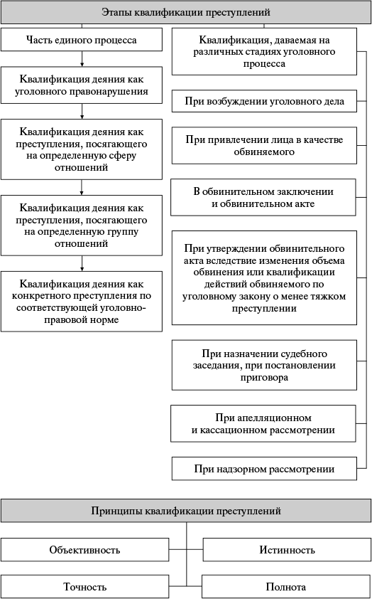 Квалификация преступления как процесс проходит в несколько этапов. Причем они выделяются по двум самостоятельным основаниям: 1) как часть единого рассматриваемого процесса; 2) как квалификация, даваемая на различных стадиях уголовного процесса. В связи с этим количество выделяемых этапов колеблется от трех до семи.