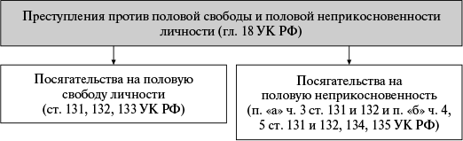 1) посягательства на половую свободу личности: изнасилование (ст. 131 УК РФ), насильственные действия сексуального характера (ст. 132 УК РФ) и понуждение к действиям сексуального характера (ст. 133 УК РФ);