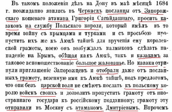 Польский Король Ян Собеский пытался оторвать Малороссию от Росии, хотя был заключен мирный договор. Он стал засылать «листы и универсалы», зазывая запорожцев на службу с платой 12 талеров. Кошевой гетман Григорий Сагайдачный действовал по принципу Ивана Сирка, который умер 1680 году, с его лозунгом «хто ляже рядом зи мною, то ще брат, а хто вище мене-той проклят». До сих пор украинцы провозглашают похожий лозунг «кто не скачет тот москаль», прошло столько лет, а менталитет не изменился. остался в их крови. Позже запорожские черкасы отрезали от скелета Сирка руку и всюду возили с собой пугая слабого противника лозунгом «стой, душа и рука Сирка с нами» размахивая костьми. Гетман Григорий Сагайдачный решил провести поход против турок и крымчан, помогая польскому королю, но Донские Казаки получили запрет о московских царей на любые действия против турок. У русского историка В.Д.Сухорукова находим про это время: