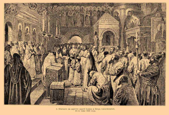 «И желая всему государству тишины, чтобы смущения и мятежу в народе не было» Иоаким велел бить во все колокола и в Соборной церкви «поставивша государей на царском месте ровно: во-первых, царя Иоанна Алексеевича, также царя Петра Алексеевича» провозгласил двое царствие. Это событие можно видеть на старинных гравюрах того времени, «Венчание на царство» Царей Иоанна и Петра Алексеевичей, за их спинами стоит Царица Софья. Далее она призвала к себе «выборных, по человеку от полка» и велела готовиться к присяге Царям, было всё исполнено вскоре «учинили веру и целовали крест». После церемонии два Царя «солдат пожаловали, велели их поить и кормить по два полка в день».