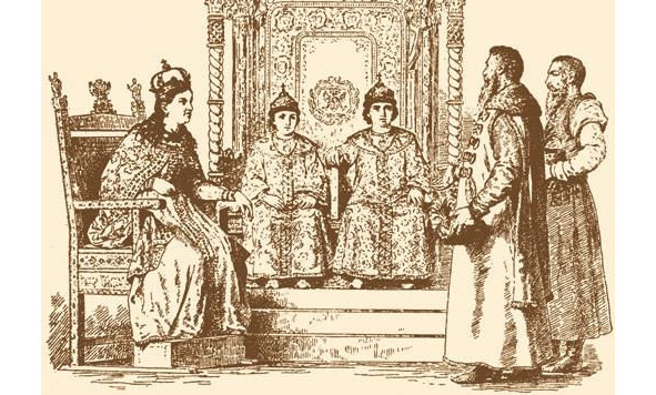 В Разрядной книге 29 мая 1682 года была сделана запись и составлен акт, о том, что Великие Государи «посоветовавшись с матерью своей Натальей Кирилловной и со своими государскими тетками и с сестрами и благородными царевнами и своим богомольцем патриархом Иоакимом и всем освященным собором» вручить правление всего Московского государства благородной Государыни и Царице, и Великой Княжне Софии Алексеевне (ей 25 лет): «…со многим прошением, для того что они в юных летах, а в великом их государстве долженствует ко всякому усмотрению многое правление… упремудрити паче инех, и кроме ее правити Росийское царствие никому невозможно». Софья конечно немного как говорят ныне «повыделывалась» и после настоятельных просьб всего окружения «…той превеликий труд восприяти изволила». Царица приказала всем думным чиновникам дела докладывать только ей «…и за теми делами изволила она, государыня, сидети з бояры в палате».