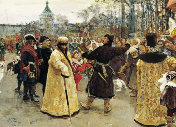 Хотелось бы здесь сделать отступление и показать читателю картину Ильи Ефимовича Репина «Приезд Царей Иоанна и Петра Алексеевичей на Семеновский потешный двор в сопровождении свиты» на ней изображен Петр, Иоанн перед смертью, а также Матвеев Лефорт и Гордон. Иоанн совсем почти не видит, видно, что он болен и его взор обращён в сторону от речей Петра. Младший брат, увидев множество служащих охотников записал их в потешные полки «излишнюю охоту уничтожить, а расходы и людей употребить в пользу государственную». Здесь мы видим момент обращения Петра к Ивану, а тому уже не до соколиной охоты и потехи доставшейся братьям от их отца Алексея Михайловича.