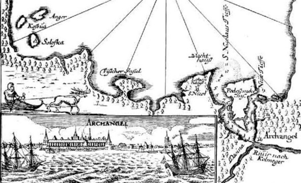 Летом 1693 года тесные озёра уже не привлекали молодого Петра, и он выпросил позволения у матери Натальи Кирилловны съездить к Архангельску посмотреть на настоящее море. Царь со свитою в 100 человек в числе которых были бояре и князья: Борис Голицын, Михаил Лыков, Василий Нарышкин, Алексей Шеин, Михаил Львов, Федор Ромодановский, Иван Бутурлин, Федор Троекуров, Федор Апраксин, генерал Лефорт, доктор Захарий Гульстен и конечно князь-папа Никита Моисеевич Зотов.