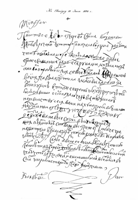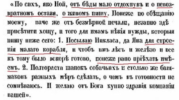 Яхту «Святой Петр» он отдал контр -адмиралу Гордону, новый же корабль «Апостол Павел» снаряжали быстрыми темпами и командовал на нём вице-адмирал Иван Бутурлин. В это время сам Государь праздновал с подчинёнными своё спасение от бури несколько дней. Из столицы пришло известие от думного дьяка Виниуса, заведующего почтой, что купленный в Голландии корабль скоро должен прийти к Архангельску. Он доносил Петру о частых пожарах в Москве и просил его вернуться скорее и навести порядок. В исторических документах сохранился собственноручный ответ Петра, который я хотел бы здесь и продемонстрировать, многим читателям интересно посмотреть, как писали в то время гусиными перьями. Петр пишет, как они спускали на воду новый корабль, обмывая его и так палили из пушек, что чуть не сожгли все купеческие барки с товарами: «Мin Her… Мой дорогой. Писмо твое и в нем перевод с писма виценова Мне вручен искоторого начала восприем радости что *S*на море конца ожидаем его дабы его же слушанием радуемеся руками могли озезат а твой корабль 11 июля савсем отделан и окрашен во имя Павла апостола и марсовым ладаном доволно курен в том же курении и бахус припочтем давольно; в том же курении и бахус припочтен был доволно… но и здесь на нептунусову державу дезну и едва не все суда, в кунчукое лежащия к ямонке стовары, все пожег; обаче чрез наши труды вема разоре; точию едину баси кровлю и бот сжег с хлебом; а возле ее была барка с пенькою и еслиб та загорело, тогда бы оню не вомоно было отнять, и чаю чтоб се пожар не меньши был все московски и корабли стары бы песком домо пошли».