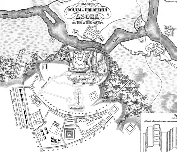 После взятии Каланчей, войска наши окружили Азов по кругу и, построив напротив крепости осадные укрепления «апроши». ГенералГордонпредложилдовести«контравалационную линию» на левом фланге, где стоял Лефорт, до самой реки, чтобы пресечь татарской коннице сообщение с городом. Он же предложил послать большой отряд на правый берег Дона для возведения «шанца» против крепости Азов. Огонь с этого места из пушек будет очень действенный, так как Азов лежит на покатом берегу к Дону, на наклонной местности и с того места видны даже улицы и дома внутри этой крепости. Часть артиллерии была расположена напротив крепости с левого фланга перед Донскими казаками. Этими крупными пушками все строения в городе Азов русские бомбардиры, включая Петра разорили и выжгли. Вокруг крепости уцелело только несколько домов за земляным валом со стороны реки Дон, и те были пробиты ядрами на вылет.
