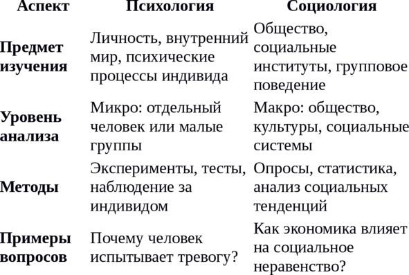 Психология фокусируется на индивидуальной психике, внутренних процессах (мышление, эмоции, мотивы) и поведении отдельного человека, в то время как социология изучает общество как целое, социальные структуры, группы и массовые взаимодействия.