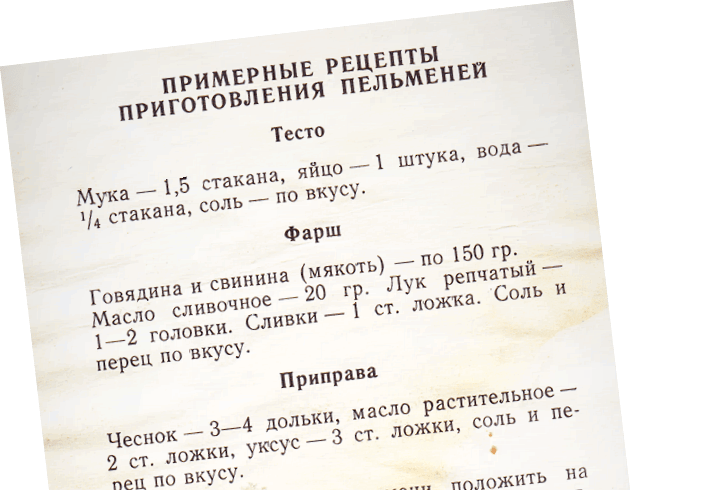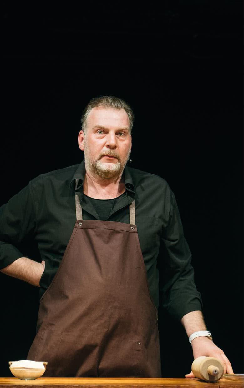 Актер лепит пельмени за своим столом. Пользуется заготовленными тестом и фаршем. На сцене телевизор, на экране которого появляются названия глав и при необходимости иллюстрации к речи героя. Также на сцене заготовлена электрическая плитка и кастрюля с водой. Весь процесс приготовления пельменей распределен по времени спектакля: нарезание кружков из листов теста, заполнение фаршем и склеивание пельменей, кипячение воды, варка пельменей.