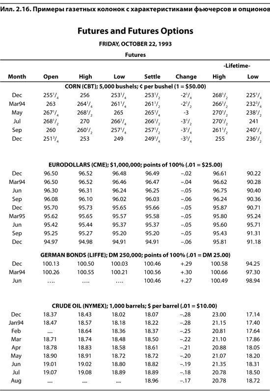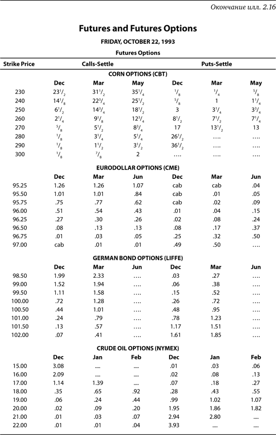 Тем, кто только начинает изучать опционы, полезно почитать деловой раздел какой-нибудь газеты, создать различные позиции в опционах и базовых контрактах и построить соответствующие графики[6]. Это позволит быстрее усвоить многочисленные понятия, введенные в первых двух главах, и значительно облегчит понимание последующего материала. Примеры публикуемых в газетах сводок по фьючерсным опционам и опционам на акции приведены на илл. 2.16.