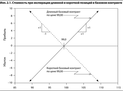 На илл. 2.1 показана стоимость при экспирации как длинной, так и короткой позиции в базовом контракте в предположении, что сделка заключена по текущей цене 99,00. По горизонтали отложены цены базового фьючерсного контракта, а по вертикали — прибыли или убытки по нашей позиции. Обратите внимание на то, что график представляет идущую под углом 45° прямую, не ограниченную ни в одном из направлений[5]. Это означает, что потенциальная прибыль или убыток по каждой позиции неограниченны. Заметьте также, что соотношение между изменением цены базового контракта и соответствующим изменением стоимости позиции равно 1:1. Если мы займем длинную позицию, то будем получать прибыль в размере одного пункта на каждый пункт роста цены базового контракта; на каждый пункт падения цены базового актива мы будем терять один пункт. Если мы займем короткую позицию, то все наоборот — на каждый пункт роста (снижения) цены базового контракта мы будем терять (получать) один пункт.