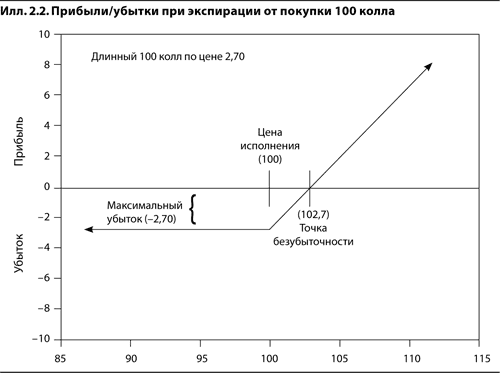Используя тот же метод оценки, мы показываем на илл. 2.2 прибыли или убытки при экспирации от покупки 100 колла по цене 2,70. Обратите внимание, что в этом случае график уже не прямая линия. Если цена базового контракта упадет при экспирации ниже 100, то 100 колл окажется вне денег, его стоимость станет нулевой, и мы потеряем 2,70, которые заплатили за этот колл. При цене базового контракта свыше 100 этот опцион будет в деньгах, а его стоимость будет расти вместе с ценой базового контракта — на один пункт на каждый пункт роста стоимости базового контракта. Если к дате экспирации цена базового контракта достигнет 102,70, то стоимость 100 колла будет равна его внутренней стоимости, т.е. 2,70, и наши прибыль/убыток окажутся нулевыми (102,70 — это точка безубыточности для данной позиции). Выше 102,70 прибыль от покупки 100 колла будет потенциально неограниченной, точно так же, как и прибыль от длинной позиции в базовом контракте.
