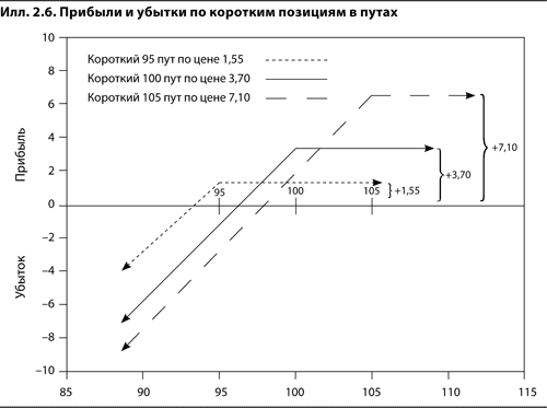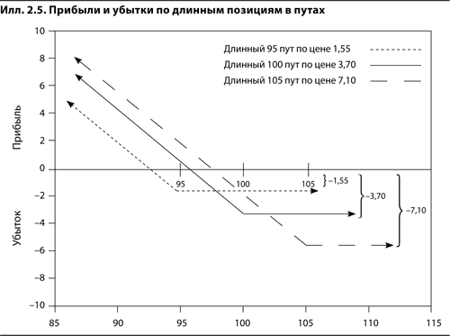 Иллюстрация 2.5 дает представление о прибылях и убытках по длинным позициям в путах с ценами исполнения 95, 100 и 105. Соотношение риск / потенциальная прибыль для данных позиций аналогично соотношению для длинных позиций в коллах, но здесь ограниченный риск связан с повышением цены, а неограниченная прибыль — с ее понижением. Результат покупки опциона будет нулевым, если цена базового контракта окажется ниже цены исполнения ровно на величину цены данного опциона (иными словами, для опциона пут точка безубыточности расположена левее страйка на величину премии). Ниже точки безубыточности потенциальная прибыль от позиции не ограничена и увеличивается на один пункт на каждый пункт снижения цены базового контракта.