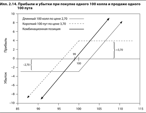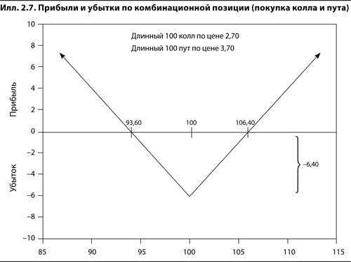 Сделки с опционами не сводятся к покупке или продаже отдельных опционов. Мы можем комбинировать опционные позиции и создавать новые позиции с уникальными характеристиками. На илл. 2.7 показаны прибыли и убытки при экспирации по комбинационной позиции, состоящей из длинного 100 колла за 2,70 и 100 пута за 3,70. Всего мы заплатили 6,40, и это максимально возможный убыток в случае, если ни один из опционов не будет исполнен. Позиция дает убыток, только если цена базового контракта составит при экспирации ровно 100. Если при экспирации цена базового контракта превысит 100, то мы не воспользуемся опционом пут, но позиция в опционе колл будет аналогична длинной позиции в базовом контракте, т.е. с ростом цены базового контракта на один пункт ее стоимость будет увеличиваться на один пункт. Если цена базового контракта упадет ниже 100, то колл утратит свою стоимость, но позиция в путе будет аналогична короткой позиции в базовом контракте, т.е. ее стоимость будет увеличиваться на один пункт на каждый пункт снижения цены базового контракта. Чтобы такая позиция оказалась как минимум безубыточной, она должна стоить, по крайней мере, те 6,40, что мы потратили в самом начале. Это произойдет, если либо 100 колл, либо 100 пут будут стоить 6,40. Для этого при экспирации базовый контракт должен стоить либо 106,40, либо 93,60. За пределами этого диапазона потенциальная прибыль не ограничена.