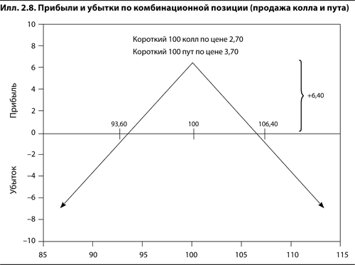 При каких условиях стоит занять позицию, показанную на илл. 2.7? Это имеет смысл, если мы ожидаем значительное движение цены базового контракта в ближайшем будущем, но не знаем его направление. Если цена изменится достаточно заметно (превысит 106,40 или упадет ниже 93,60), то данная позиция окажется прибыльной. Конечно, можно предположить и противоположное, т.е. что цена базового контракта вряд ли упадет ниже 93,60 или превысит 106,40. В этом случае имеет смысл продать оба опциона (илл. 2.8). Теперь наша прибыль ограничена суммарной премией в 6,40, в то время как наш риск в любом направлении не ограничен. Но если есть веские основания полагать, что цена базового контракта не выйдет из диапазона 93,60–106,40 до даты экспирации, то подобный риск может быть вполне оправданным.