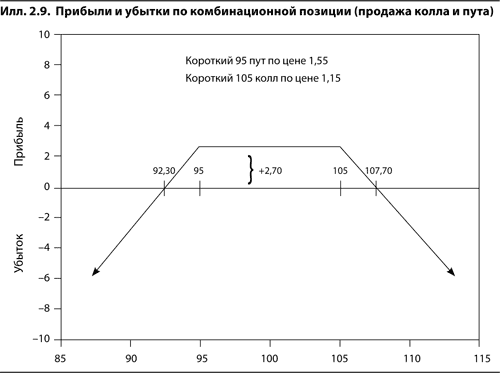 Допустим, мы придерживаемся сценария на илл. 2.8, т.е. полагаем, что вероятность значительного изменения цены базового контракта в любом направлении невелика. Но поскольку каждый может ошибаться, нам хотелось бы расширить прибыльный диапазон и выйти за пределы интервала 93,60–106,40. Для этого вместо продажи 100 колл и 100 пут мы продаем 95 пут за 1,55 и 105 колл за 1,15. Прибыль от этой позиции (см. илл. 2.9) будет максимальной и равной 2,7 при любой цене базового контракта в диапазоне от 95 до 105, поскольку оба опциона останутся неисполненными. Нам не грозит убыток, если цена базового контракта не упадет при экспирации ниже 92,30 или не превысит 107,70. В первом случае 95 пут будет стоить минимум 2,70, а в последнем столько будет стоить 105 колл. Конечно, расширение прибыльного диапазона требует жертв. Максимальная прибыль теперь составляет только 2,70, в то время как на илл. 2.8 она достигала 6,40. В обмен на снижение риска мы должны довольствоваться меньшей потенциальной прибылью. Опционным трейдерам постоянно приходится выбирать между вариантами «низкий риск — низкая возможная прибыль» и «высокий риск — высокая возможная прибыль». Если потенциальная прибыль достаточно велика, то можно пойти на большой риск. Если потенциальная прибыль мала, то и связанный со сделкой риск должен быть низким.