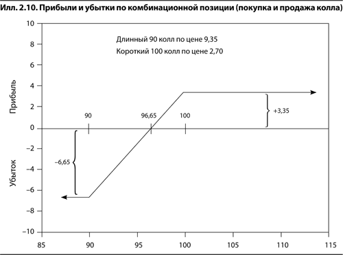 Если мы играем на понижение, то можем ограничить риск и прибыль, заняв позицию, противоположную показанной на илл. 2.10. Иначе говоря, мы продаем 90 колл и покупаем 100 колл. В этом случае максимальная прибыль составит 6,65, если цена базового контракта к дате экспирации упадет ниже 90, а максимальный убыток — 3,35, если цена базового контракта превысит 100.