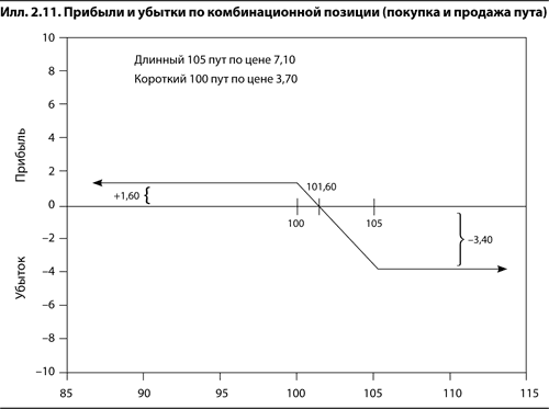 Медвежью позицию с ограниченным риском и ограниченной прибылью можно также создать, купив пут с более высокой ценой исполнения и продав пут с более низкой ценой исполнения. Например, мы можем купить 105 пут за 7,10 и продать 100 пут за 3,70 при суммарных затратах в 3,40 (илл. 2.11). Если на день экспирации цена базового контракта упадет ниже 100, то 105 пут будет стоить ровно на 5 пунктов больше, чем 100 пут, и мы получим максимальную прибыль 1,60. Если же цена базового контракта превысит 105, то оба опциона не будут стоить ничего и мы потеряем все наши инвестиции в размере 3,40. Позиция безубыточна, если цена базового контракта составляет 101,60, поскольку при этом 105 пут стоит 3,40. Эта позиция медвежья, как и прямая покупка пута. Однако мы отказываемся от неограниченной потенциальной прибыли при падении цены, которую дает прямая покупка 105 пута, в обмен на частичную защиту от риска, которую обеспечивает продажа 100 пута.