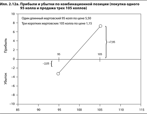 Первый шаг — определить прибыль и убыток при каждой цене исполнения (95 и 105). Если цена базового контракта составит 95, то 95 и 105 коллы не исполняются и их стоимость равна нулю. Поскольку на создание позиции было потрачено 2,05 (–5,50 + 1,15 × 3), то при цене базового контракта 95 позиция принесет убыток, равный 2,05. Если цена базового контракта составит 105, то 95 колл будет стоить 10,00, а 105 колл не будет стоить ничего. Поскольку у нас есть 95 колл, позиция будет стоить 10 минус первоначальные расходы 2,05, т.е. 7,95. Нанесем эти точки на график и соединим их (илл. 2.12а).