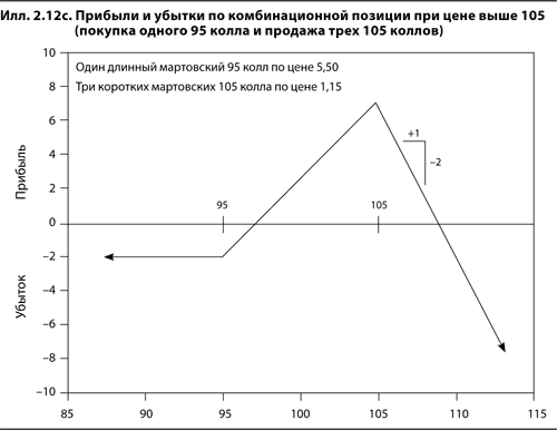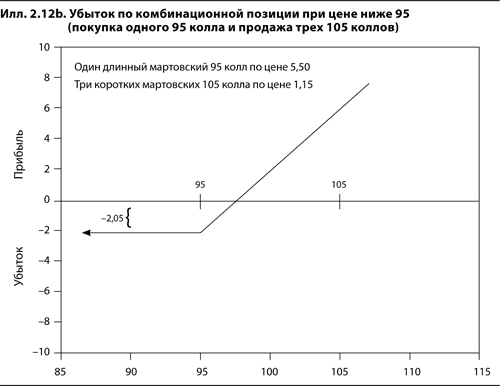 Так как в нашей позиции нет путов, максимальный убыток при падении цены равен тем 2,05, которые потребовались для создания позиции. Такой убыток мы получаем при ценах ниже 95 (илл. 2.12b).
