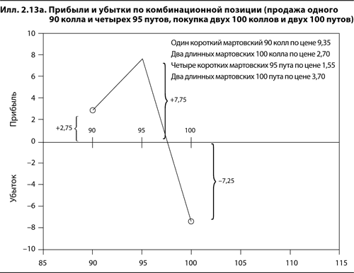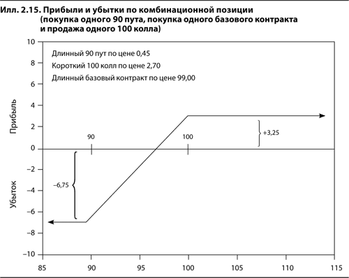 Стоимость позиции при экспирации показана на илл. 2.15. Обратите внимание на сходство этой позиции с той, что показана на илл. 2.10. Единственное различие состоит в том, что мы заменили длинный 90 колл на комбинацию длинного 90 пута и длинного базового контракта. Сочетание длинного 90 пута и длинного базового контракта должно имитировать длинный 90 колл. Чтобы убедиться в этом, читатель может построить график прибылей и убытков при экспирации для следующих двух позиций: