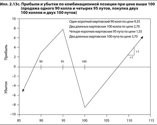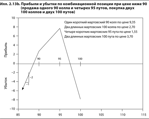 При цене ниже 90 стоимость всех коллов станет нулевой, а все путы будут вести себя как короткие базовые контракты. Поскольку чистая позиция эквивалентна двум коротким путам, график будет соответствовать двум длинным базовым контрактам. На каждый пункт падения цены базового контракта ниже 90 позиция будет дешеветь на два пункта (илл. 2.13b).