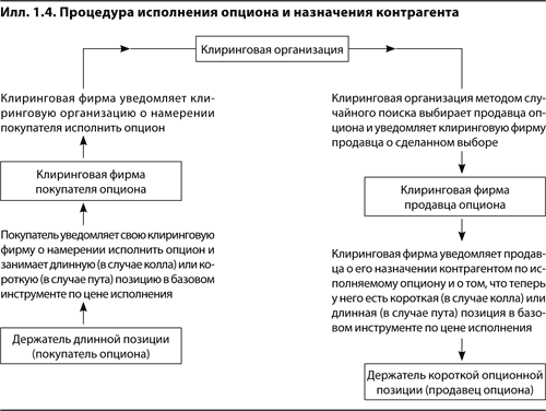 Чтобы исполнить опцион, трейдер должен направить уведомление либо продавцу, если опцион куплен у дилера, либо гаранту (клиринговой организации), если опцион куплен на бирже. После получения правильно составленного уведомления назначается продавец опциона. В зависимости от типа опциона продавец обязан занять либо длинную, либо короткую позицию в базовом контракте (купить или продать базовый контракт) по установленной цене исполнения.