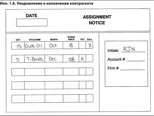 Трейдер, у которого есть опцион колл или пут, имеет право исполнить этот опцион до даты экспирации, превратив его тем самым в длинную позицию в базовом активе в первом случае или в короткую позицию во втором. Трейдер, исполняющий октябрьский 21 колл на сырую нефть, занимает длинную позицию в одном октябрьском фьючерсном контракте по цене 21 долл. за баррель. Трейдер, исполняющий мартовский 80 пут на акции GE, занимает короткую позицию в 100 акциях GE по цене 80 долл. за акцию. В случае исполнения опциона его действие прекращается, как и в случае истечения опциона без исполнения.
