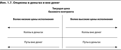 Наконец, об опционе, цена исполнения которого совпадает с текущей ценой базового контракта, говорят, что он на деньгах (at-the-money). Технически такой опцион вне денег, так как у него нет внутренней стоимости. Однако мы проводим грань между опционами на деньгах и вне денег, поскольку временная премия опционов на деньгах больше и торговля ими идет очень активно.