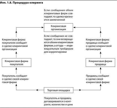 Если клиринговая фирма не может выполнить условия контракта, то конечную ответственность несет клиринговая организация. Каждая биржа является членом клиринговой организации или учреждает собственную клиринговую организацию, которая гарантирует выполнение условий всех сделок. После заключения сделки по покупке или продаже опциона отношения покупателя и продавца прекращаются, а клиринговая организация выступает в роли покупателя для всех продавцов и продавца для всех покупателей. Если бы центральной клиринговой организации не было, то в случае исполнения опциона покупатель целиком зависел бы от добросовестности продавца или его клиринговой фирмы. Поскольку клиринговая организация гарантирует все сделки, покупатели могут быть уверены, что при исполнении опциона всегда найдется контрагент, готовый осуществить поставку или принять поставленный актив. Процедуру клиринга показывает илл. 1.8.