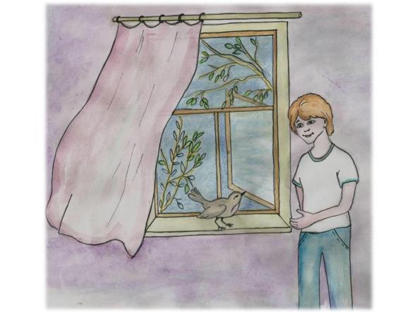 Ваня, дрожа всем телом от страха, потихоньку выглянул из укрытия. Не совсем выглянул, а настолько, чтобы можно было увидеть окно. На окне сидела небольшая птичка и клювом стучала по стеклу. Мальчику стало жаль промокшую пичугу: «Видно, озябла от холодного дождя и ветра, вот и просится к людям в жилище, чтобы согреться!»