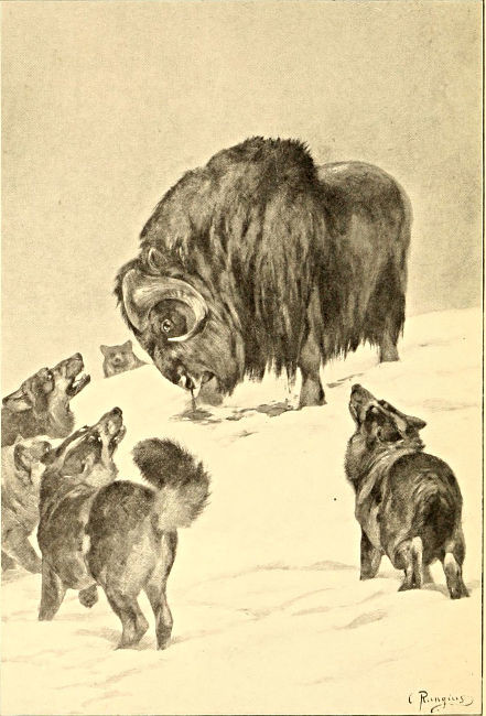 Every one now busied himself turning loose his dogs,—a small matter for the Indians, with their simply sewn harness from which the dogs were easily slipped, but a rather complex job for me. My dog train had come from the Post, and its harness was made of buckles and straps and things not easily undone in freezing weather; so it happened that by the time my dogs were unhitched, the Indians and all their dogs were fully quarter of a mile nearer the musk-oxen than I and running for very dear life. My preconceived notions of the musk-ox hunting game were in a jiffy jolted to the point of destruction, as I now found myself in a situation neither expected nor joyful. It was natural to suppose some assistance would be given me in this strange environment, and that the consideration of a party of my own organizing and my own paying should be my killing the musk-ox for which I had come so long a distance. But we were a long way from the Post and interpreters and restraining influences; and at this moment of readjustment I speedily realized that it was to be a survival of the fittest on this expedition, and if I got a musk-ox it would be of my own getting. It comforted me to know that, even though somewhat tucked up as to stomach, due to three days’ hard travel on only tea, I was in fine physical condition, and up to making the effort of my life.