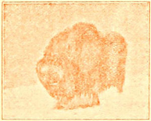 So the day dragged on without sight of a moving creature, not even a fox, and it was past noon when we laboriously worked our way up one particular ridge which seemed to have an unusual amount of unnecessary and ragged rock strewn over its surface. I remember we scarcely ventured to look into the white silent country that stretched in front of us; disappointment had rewarded our long searchings so often that we had somehow come to accept it as a matter of course. Squatting down back of the sledge in shelter from the wind seemed of more immediate concern than looking ahead for meat: at least we were sure of the solace our pipes gave. Thus we smoked in silence, with no sign of interest in what the immediate country ahead might hold for us, until Beniah, the leader of my Indians, and an unusually good one, started to his feet with an exclamation and, hurriedly climbing on top a good-sized rock, stretched his arm ahead, obviously much stirred with excitement. He shouted, once and loud, “ethan,”[2] and then continued mumbling it as though to make his tongue sure of what his eyes beheld. We all gathered around him, climbing his rock or on other ones, in desperate earnestness to see what he saw in the direction he continued pointing. It was minutes before I could discern anything having life in the distance which reached away to the horizon all white and silent, and then I detected a kind of vapor arising apparently from some dark objects blurringly outlined against the snow about four miles away; it was the mist which arises from a herd of animals where the mercury is ranging between sixty and seventy degrees below zero, and on a clear day may be seen five miles away. Thoroughly aroused now, I got my field-glasses from my sledge and searched the dark objects under the mist. They were not caribou, of that I was certain; as to what they were I was equally uncertain, for the forms were strange to my eye. So I handed the glasses to Beniah, saying, “ethan illa.”[3] Beniah took the glasses, but as it was the first time he had ever looked through a pair, their range and power seemed to excite him quite as much as did the appearance of the game itself. When he did find his tongue, he fairly shouted, “ejerri.”[4] I had no accurate knowledge of what “ejerri” meant, but assumed we had sighted musk-oxen. Instantly all was excitement. The Indians set up a yell and rushed for their sledges, jabbering and laughing. It seemed incredible that these were the same men who so shortly before had sat silent with backs to the wind, dejected and indifferent.