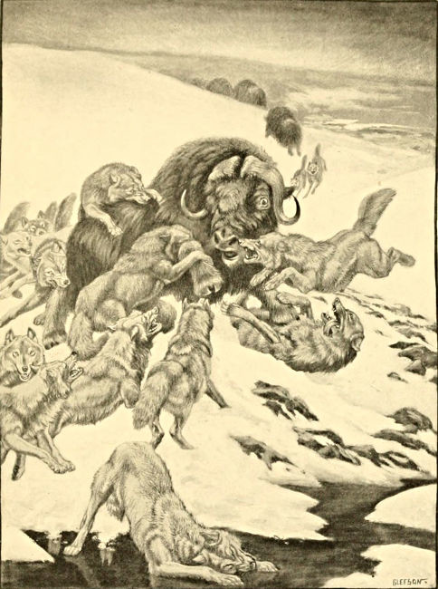 Then in a sixty-seven degrees below zero temperature we rolled up in our furs, while the dogs howled and fought over the carcass of my first musk-ox.