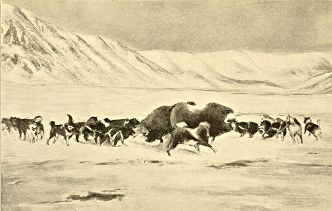 In another half hour’s running, as I worked up the near side of a rather higher and broader ridge than any we had crossed, I heard the dogs barking, and speeding to the top, what was my disappointment, not to say distress, at beholding twenty-five to thirty musk-oxen just startled into running along a ridge about a quarter of a mile beyond Seco, who, with his dogs, was in full chase after them about fifty yards ahead of me. What I thought at that time of the Northland Indian hunting methods, and of Seco and all my other Indians in particular, did the situation and my condition of mind scant justice then—and would not make goodly reading here. Had I been on an ordinary hunting expedition, disgust with the whole fool business would, I doubt not, have been paramount, but the thought of the distance I had come and the privations undergone for no other reason than to get a musk-ox, made me the more determined to succeed despite obstacles of any and all kinds. So I went on. The wind was blowing a gale from the south when I reached the top of the ridge along which I had seen the musk-oxen run, and the main herd had disappeared over the northern end of it, and were a mile away to the north, travelling with heads carried well out, though not lowered, at an astonishing pace and ease over the rocks. Four had separated from the main body and were going almost due east on the south side of the ridge. I determined to stalk these four, because I could keep the north side of the ridge, out of sight, and to leeward, feeling certain they would sooner or later turn north to rejoin the main herd. It seemed my best chance. I perfectly realized the risk I ran in separating from the Indians; but at that moment nothing appeared so important as getting a musk-ox, for which I had now travelled nearly twelve hundred miles on snow-shoes.