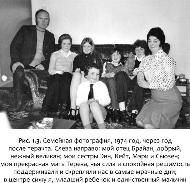 После того как боевики ушли, посетители стремглав бросились к передним дверям. Брайан рванул по черной лестнице, чтобы предупредить Терезу и дочерей, которые все еще болтали в гостиной, после чего кинулся в комнату спящего шестилетнего сына, схватил того с кровати и ринулся вон, вниз по лестнице, через боковую дверь на другую сторону улицы. И только тут с облегчением увидел, что Тереза с дочерьми тоже благополучно выбрались наружу.
