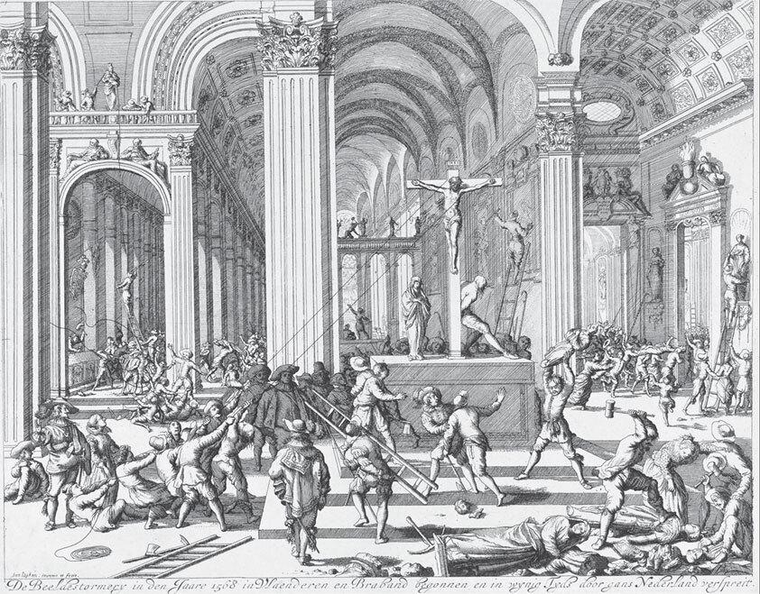 В 1566 году кальвинисты вышли из подполья и набросились на святые образа – иконы и статуи в церквях. Историки назвали это «иконоборческим восстанием». По словам А. Пиренна, восстание было тщательно организовано: «По деревням Нижней Фландрии разъезжали агитаторы, показывавшие якобы скрепленные королевской печатью письма с приказом грабить церкви… 11 августа неожиданно разразилось восстание иконоборцев… Во всех окрестных деревнях появились организованные толпы с веревками и палками, руководимые людьми, действовавшими по заранее установленному плану, и разгром начался. В церквах, посреди вихря пыли и грохота падающих и разбиваемых статуй и окон, бесновалась толпа одержимых людей, разбивавших все, что попадалось им на пути, раздиравших на части иконы, ломавших церковную утварь, надевавших на себя духовные облачения, попиравших ногами причастие и распивавших освященное вино… Разрывали на части книги и рукописи, доходили даже до осквернения гробниц. В погребах аббатства напивались вином, и с наступлением ночи разгром и оргии продолжались при свете свечей далеко за полночь»[26].
