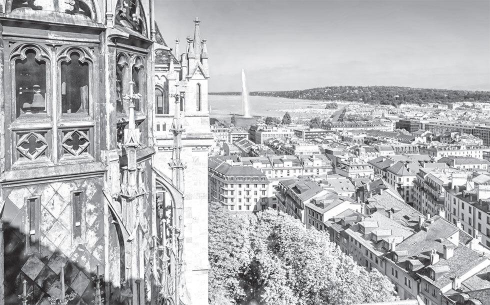 Вид на Женеву с обзорной площадки собора Святого Петра (Швейцария)