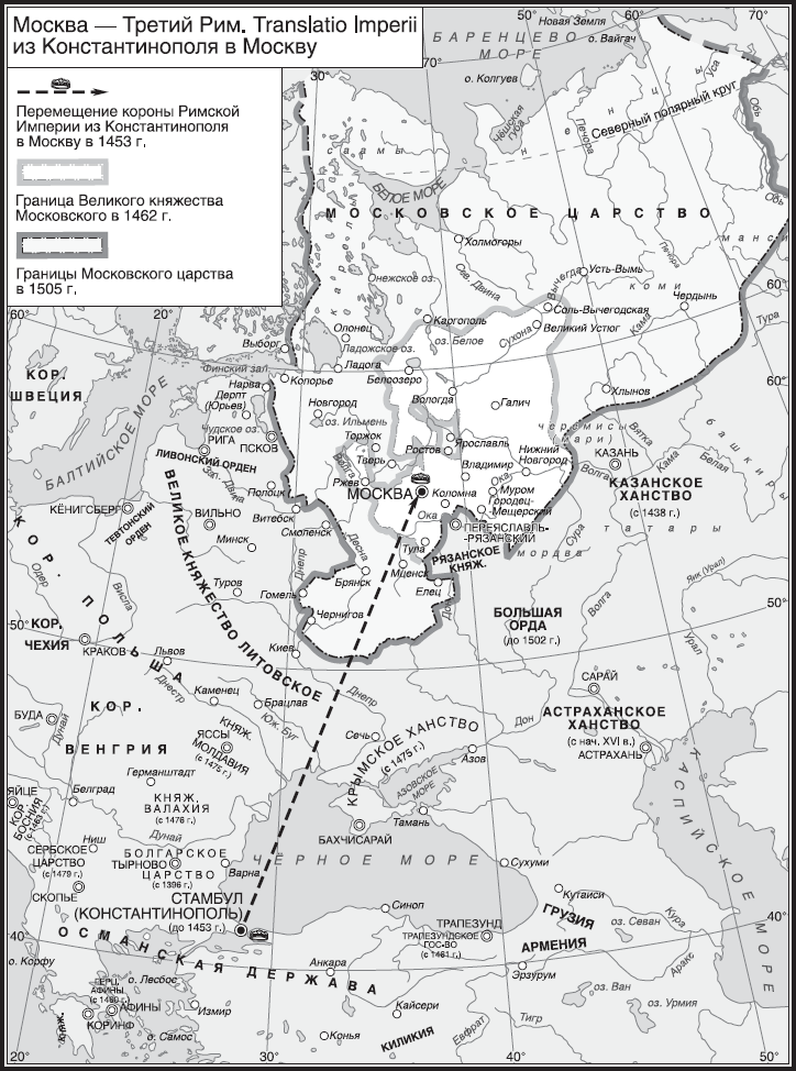 До падения Константинополя Русь никогда не мыслила себя центром православного мира. Царьград, как русские называли столицу Империи, являлся для русских государей, Русской Церкви и русских книжников безусловным сердцем христианской вселенной, городом царей. В 1439 году это сердце изменило православию, а в 1453 году перестало биться, захваченное турками. Несколько десятилетий спустя на земле Московской Руси, ставшей Россией, в политическом и военном плане все было готово для того, чтобы объединенное Русское государство могло принять на себя миссию Империи.
