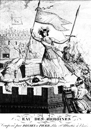 Именно этой долгожданной победе был посвящен, в частности, один из барельефов, украсивший в 1804 г. памятник французской героине, установленный в Орлеане с полного одобрения и при содействии первого консула Республики Наполеона Бонапарта [15]. Скульптор Эдм Гуа — младший изобразил Жанну со знаменем и мечом в руках, попирающей поверженных противников на крепостных стенах города (ил. 3). Еще более показательной стала анонимная гравюра начала XIX в., на которой Орлеанская Дева была представлена с теми же атрибутами, призывающей своих сторонников на бой и вновь идущей по трупам врагов (ил. 4). Данное изображение в еще большей степени напоминало композицию «Свободы, ведущей народ» и, таким образом, вполне могло послужить источником вдохновения для Эжена Делакруа, поскольку размещалось оно на рекламном плакате знаменитой парфюмерной компании «Диссей и Пивэ», которая располагалась в то время в самом центре Парижа — на улице Сен-Мартен [16], в непосредственной близости от Лувра, где постоянно бывал художник, учившийся с 1816 г. в Школе изящных искусств.