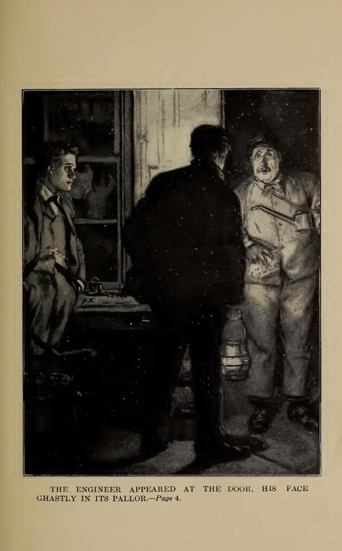 The final words were obliterated by a roar as of a descending avalanche, and the express tore past, ripping the night and the silence; fifty miles an hour at the least; the long line of curtained windows in the sleeping-cars shimmering in the station lights like a wavering biograph picture—there and away while you drew your breath. In the stillness that followed, the brass instrument kept up its useless, idiotic chatter. A heavy step sounded on the platform, and the engineer appeared at the door, his face ghastly in its pallor, the smudges on it giving a heightening effect of contrast.